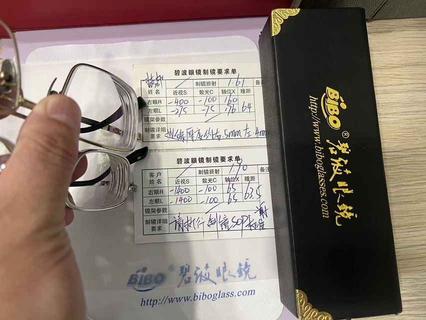 面对这样的数据——右眼/-14.00,左眼/-14.00,联合散光-1.00,这不仅仅是一串冰冷的验光参数,更是一份沉甸甸的责任。如何将超过1400度近视的眼镜演绎出接近普通眼镜的视觉效果?这是摆在碧波眼镜团队面前的技术考题。